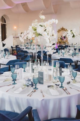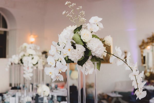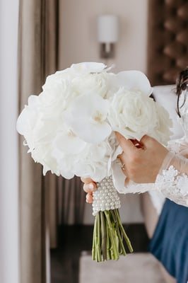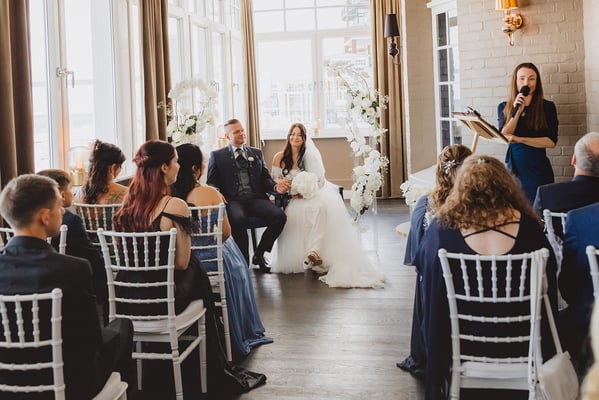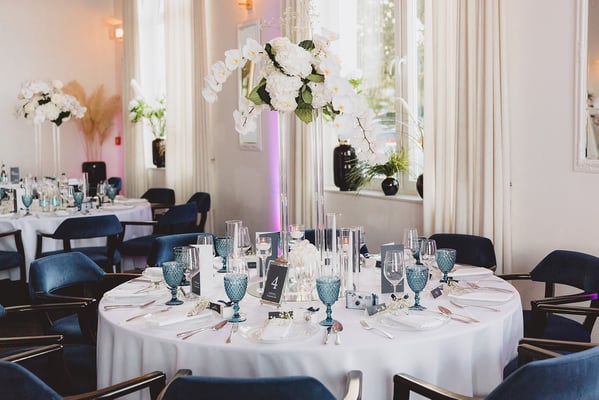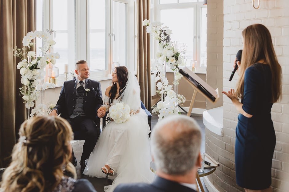Die freie Trauung mit Nadja Krüger fand in einem hellen Salon des Hotels statt – liebevoll dekoriert mit weißen Orchideen, edlen Kerzenlichtern und zarten Gräsern. Die Blumendekoration war ganz in Weiß gehalten, was nicht nur zeitlos-elegant wirkte, sondern auch die maritime Leichtigkeit unterstrich. Die Kombination aus modernen Acrylsäulen und fließenden Blumenarrangements ließ den Raum strahlen und verlieh der Zeremonie eine fast schwebende Ästhetik.