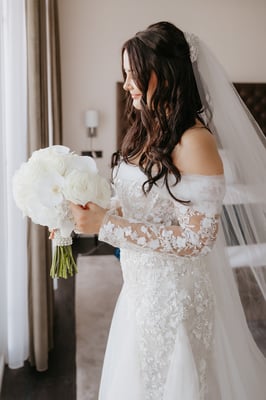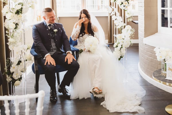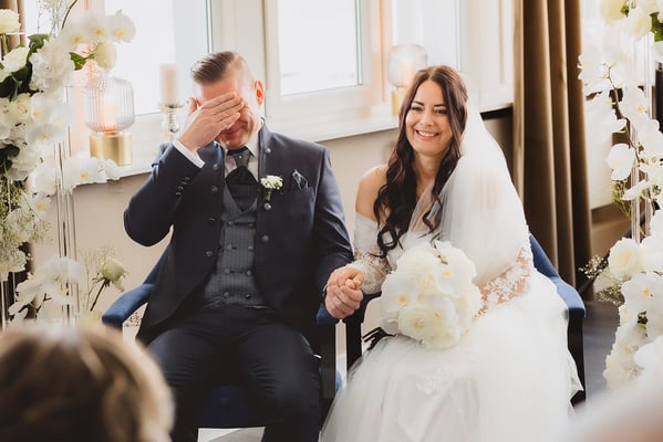 Das Brautpaar – stilvoll und authentisch – strahlte eine tiefe Verbundenheit aus. Die Braut im fließenden Kleid mit Schleier, der Bräutigam im klassischen dunklen Anzug mit Weste. Besonders berührend: der Moment, in dem sie sich während der Trauung die Hände hielten und sich verliebt anlächelten – ein echtes Herzensfoto.